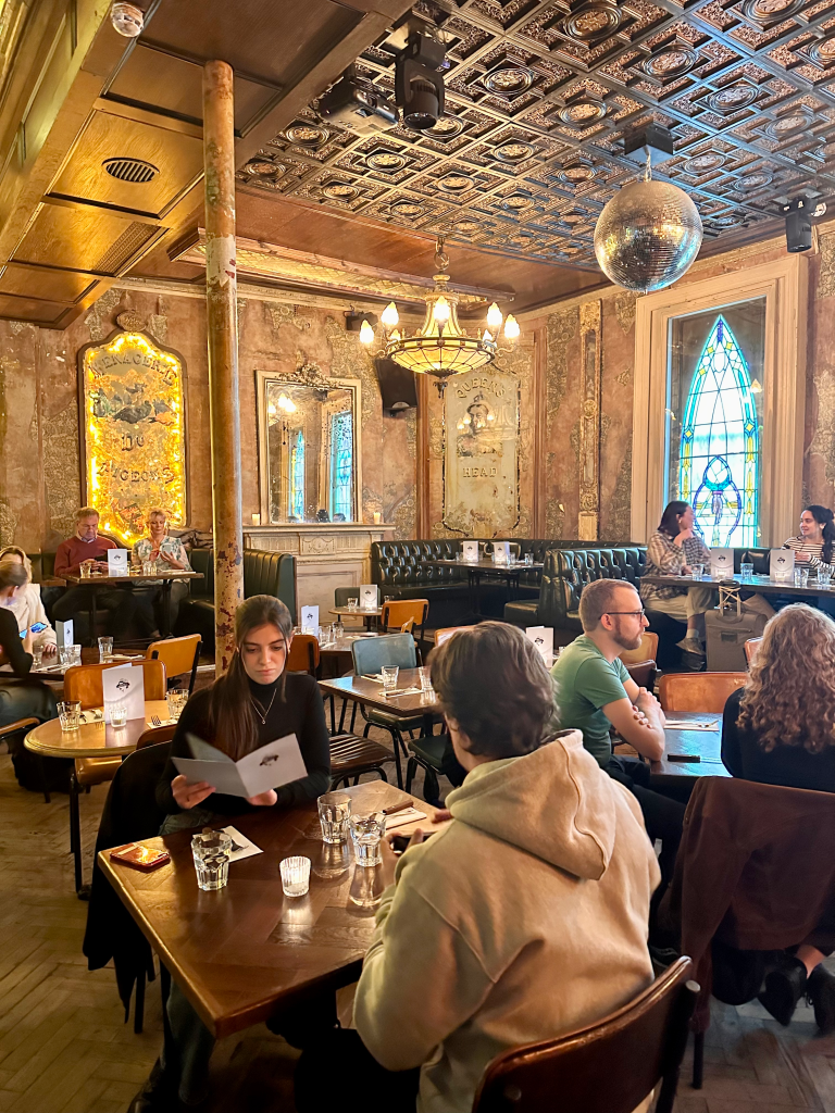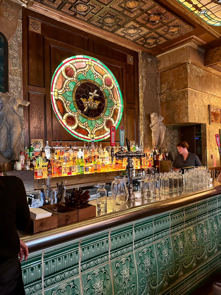 The decor here is warm, vintage and welcoming. Upstairs, you’ll find leather booths around the perimeter of the room, along with mismatched chairs and wooden tables in the centre. At the edge of the room, there’s a bar covered in the venue’s signature green ceramic tiles. The stained glass windows block out most of the light, so you can’t really tell if it’s morning or night. There’s plenty of room upstairs and downstairs, so The Old Queens Head would be fit for a dog of any size. Especially if they’re a fan of Rhythm and Blues.